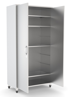 Esse sistema garante a estruturação da porta e proporciona uma superfície lisa interna e externa, o que é o ideal para salas limpas. A porta em aço inoxidável é adequada para situações em que seja necessária mais resistência ou permitir que o conteúdo do móvel seja protegido da visualização externa.Para facilitar a análise do conteúdo interno, temos o Armário Palmetal PC que possui portas em policarbonato.