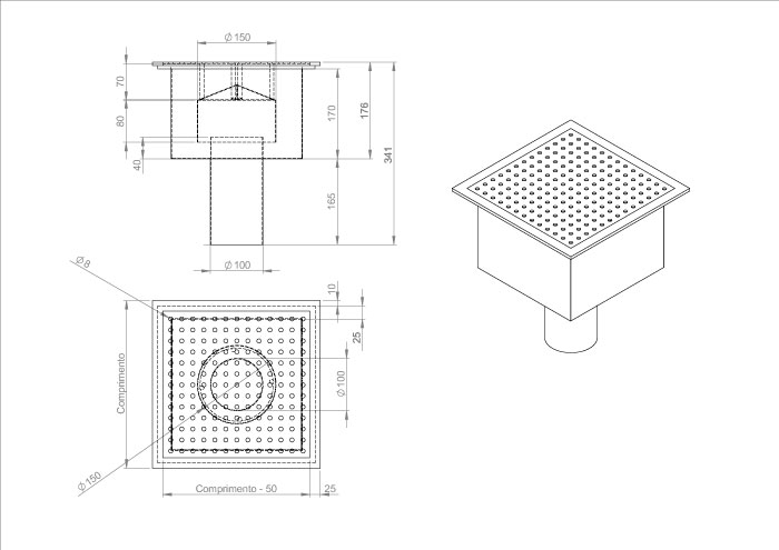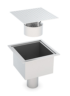 É composto de duas partes: uma parte fixa com saída de diâmetro nominal de 100mm para ser embutida no piso do local; e outra parte encaixável e removível composta de grelha que evita a obstrução do encanamento e sifão que impede a propagação de odores.