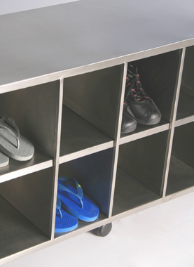 Fabricado em aço inox AISI 304, em chapa 1mm #20, acabamento polido ou escovado. Possui duas fileiras de divisórias para armazenar sapatos ou outros objetos. Número de divisórias de acordo com o comprimento escolhido.