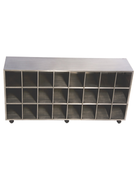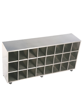Fabricado em aço inox AISI 304, em chapa 1mm #20, acabamento polido ou escovado. Possui três fileiras de divisórias para armazenar sapatos ou outros objetos. Número de divisórias de acordo com o comprimento escolhido.