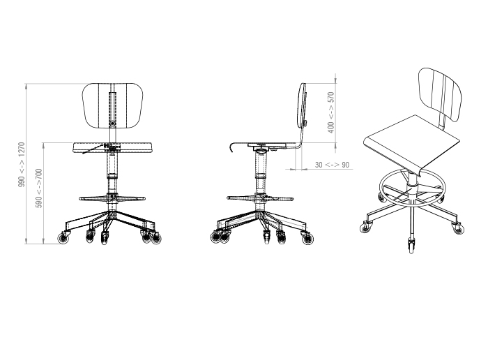 Dimensões Principais: Assento: 500 mm x 400mm Encosto: 388mm x 280 mm Variação de Altura: 990 mm <-> 1270 mm Variação da Altura do encosto: 400 mm <-> 570 mm Variação da Profundidade do encosto: 30 mm <->90 mm Variação da altura do Assento: 590 mm <->700 mm Capacidade para até: 200 kg