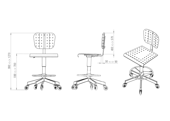 Dimensões Principais: Assento: 500 mm x 400mm Encosto: 388mm x 280 mm Variação de Altura: 835 mm <-> 1110 mm Variação da Altura do encosto: 400 mm <-> 570 mm Variação da Profundidade do encosto: 30 mm <->90 mm Variação da altura do Assento: 590 mm <->700 mm Capacidade para até: 200 kg