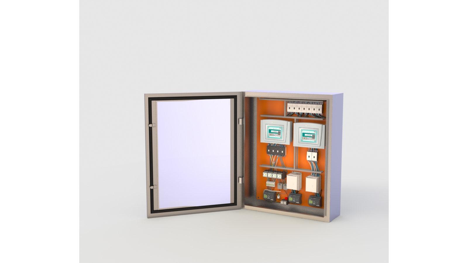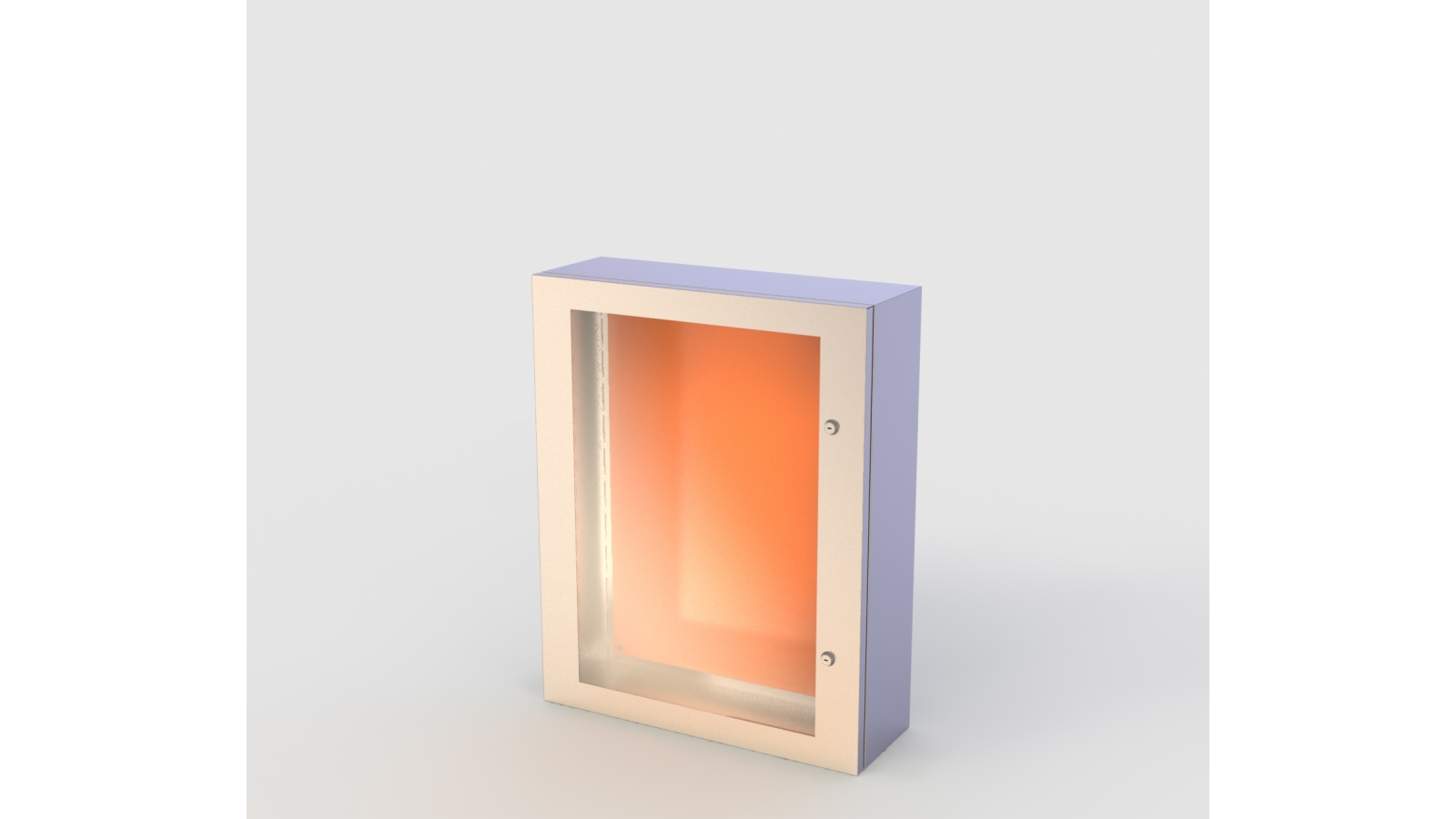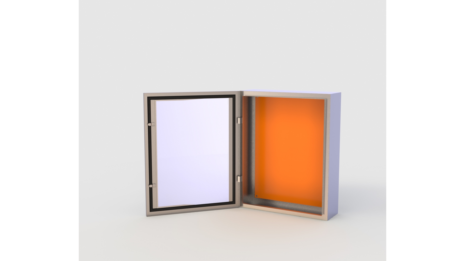 Espessura de chapa da porta1,5mm - #16. Espessura da chapa do corpo 1,2mm - #18. Placa de montagem de alumínio de 4mm de espessura, na cor laranja.