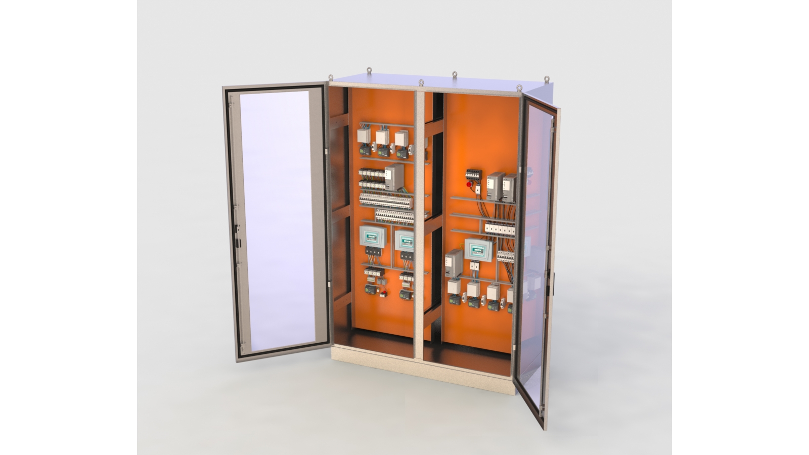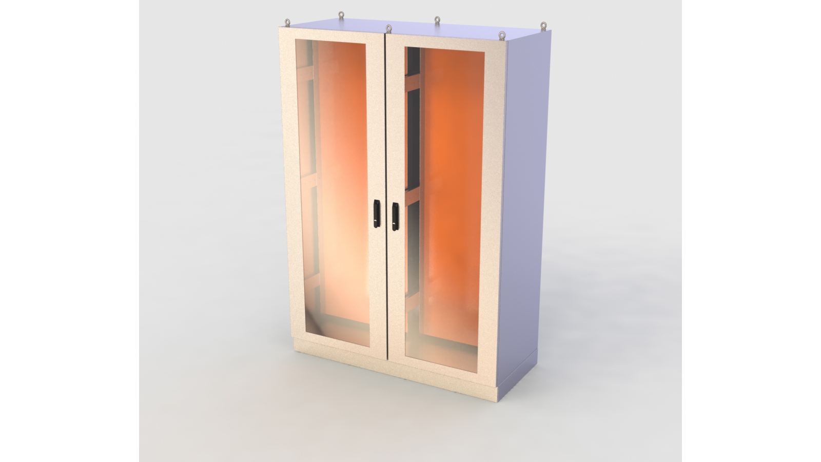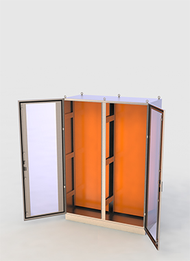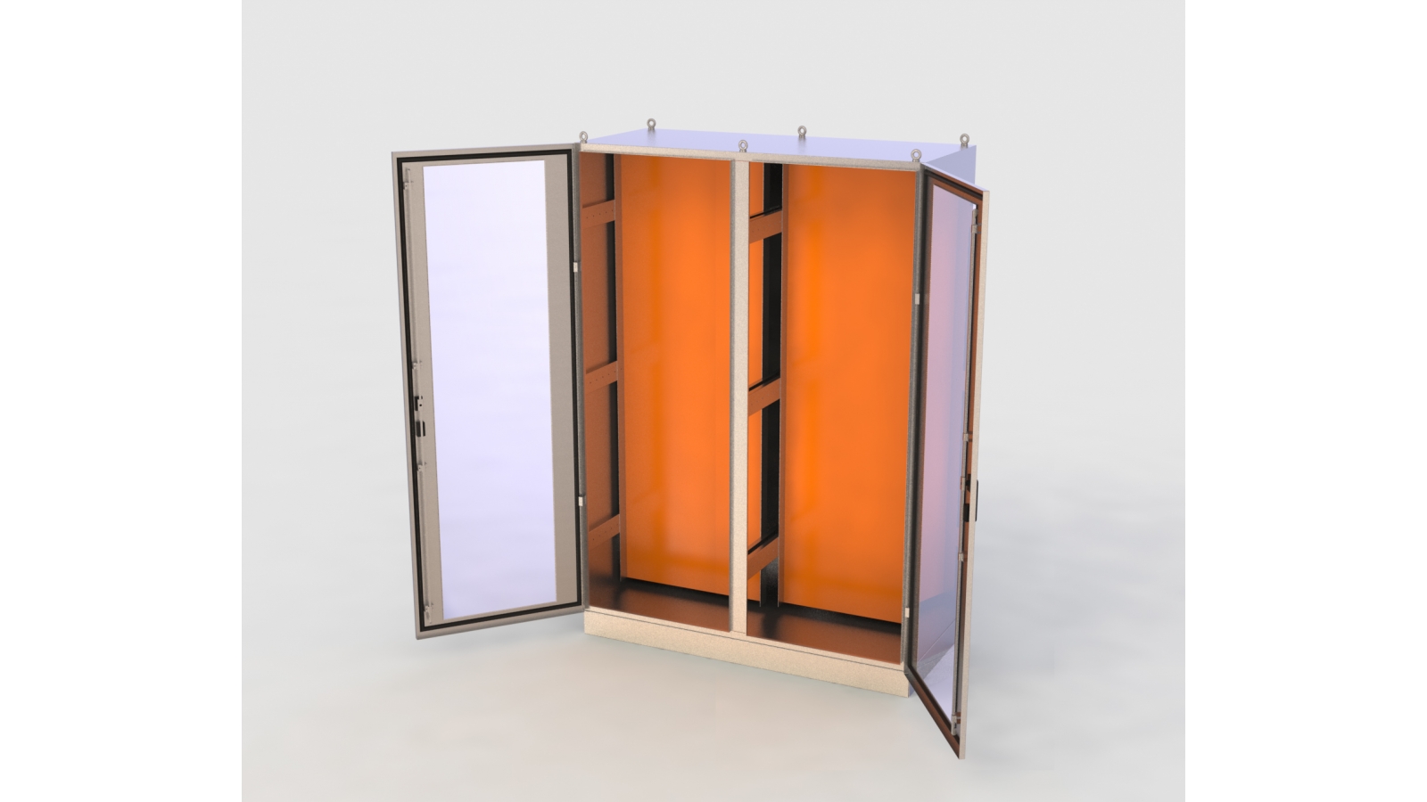 Modelo com 02 portas e divisória central. Equipado com soleira de 100mm e 06 olhais de aço inox para içamento da caixa. Modelo com trilho de aço inox para posicionamento adequado das placas de montagem.