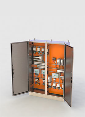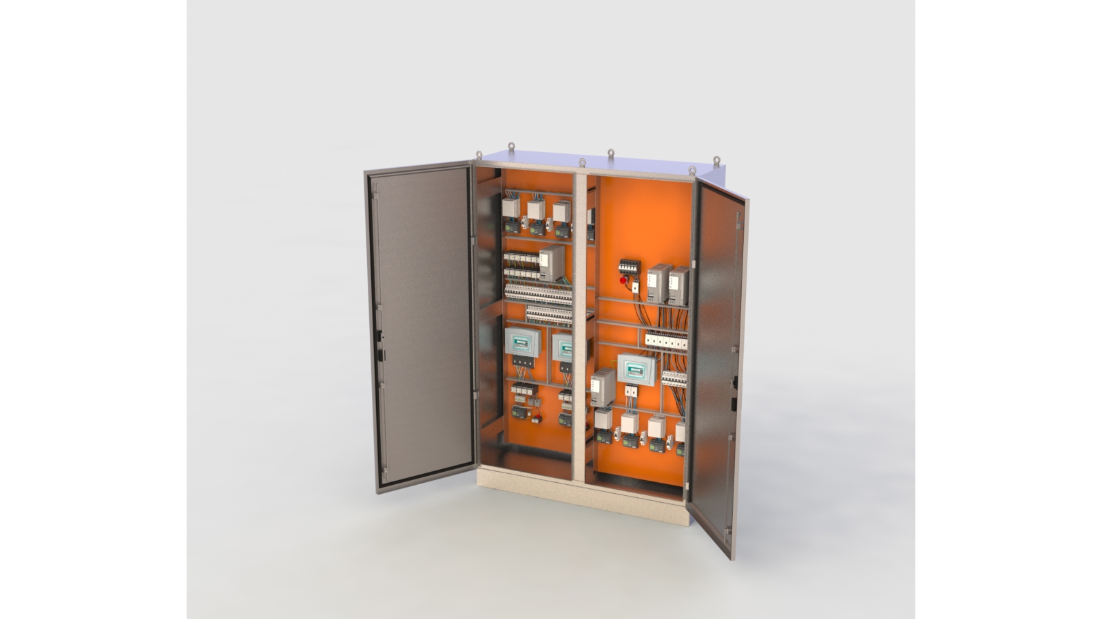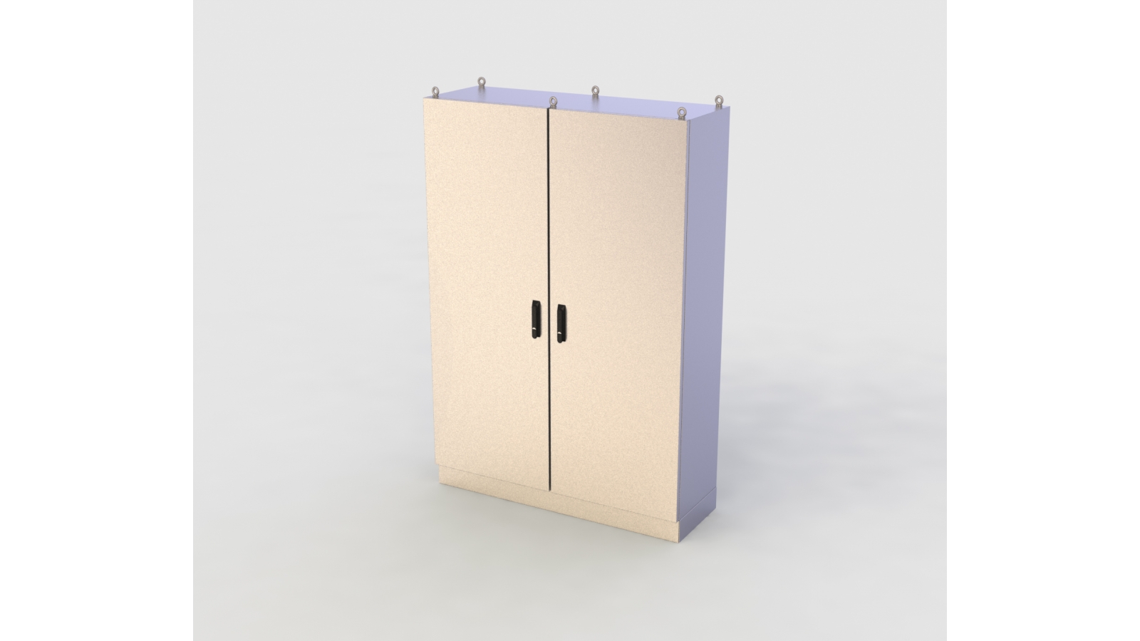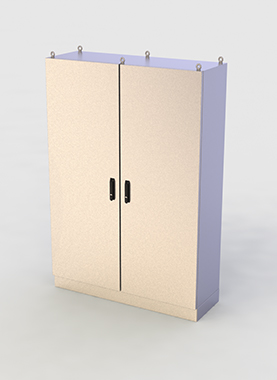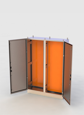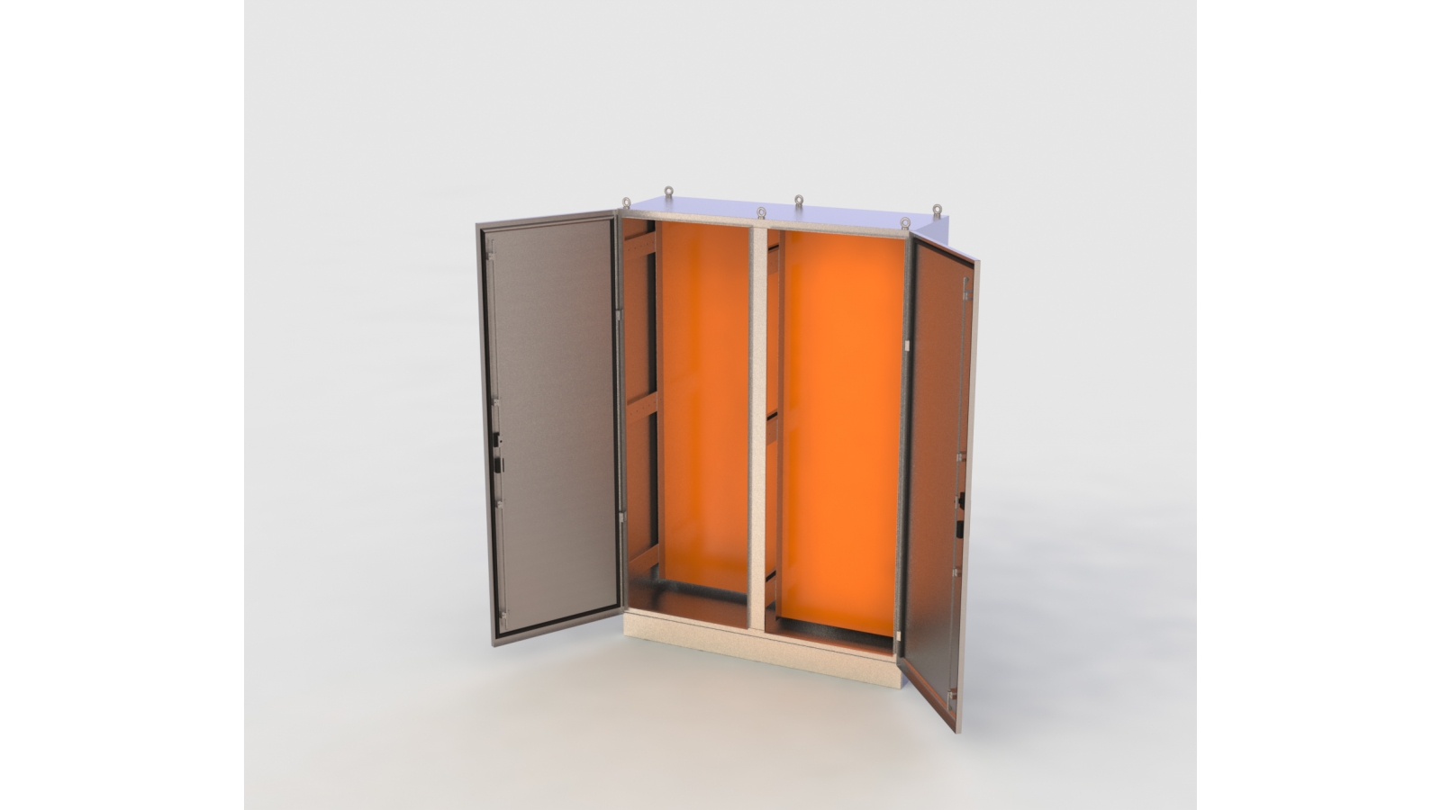 Modelo com 02 portas e divisória central. Equipado com soleira de 100mm e 06 olhais de aço inox para içamento da caixa. Modelo com trilho de aço inox para posicionamento adequado das placas de montagem.