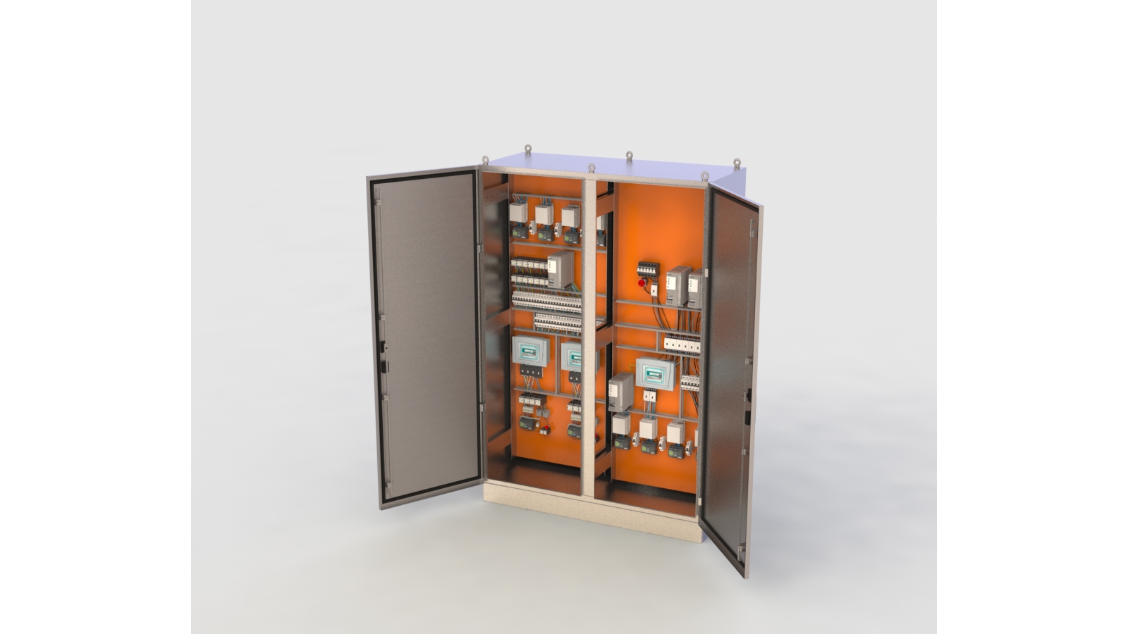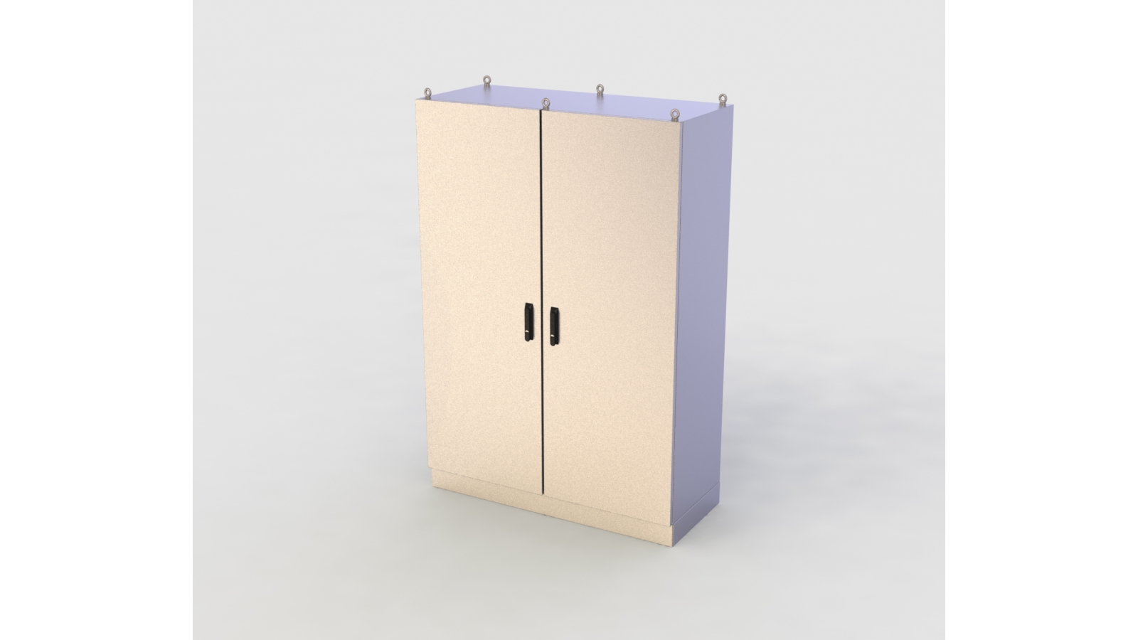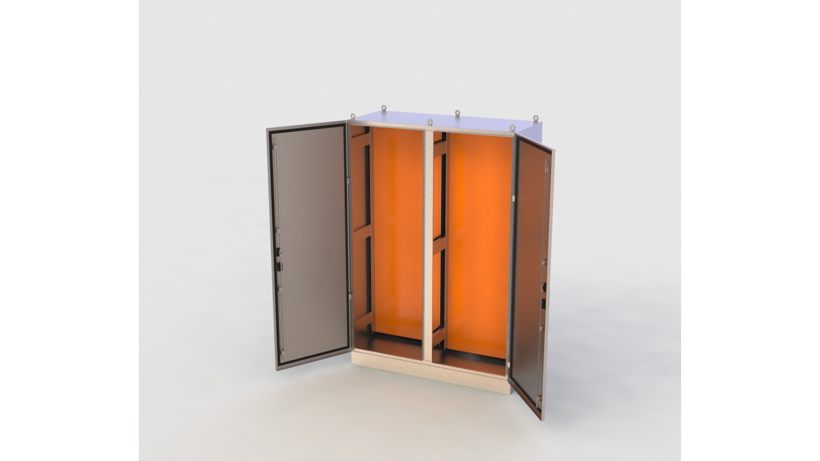 Modelo com 02 portas e divisória central. Equipado com soleira de 100mm e 06 olhais de aço inox para içamento da caixa.