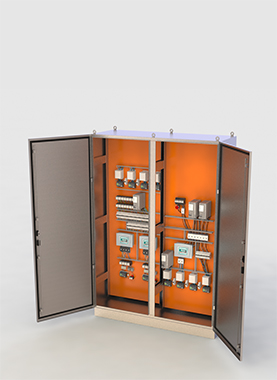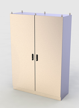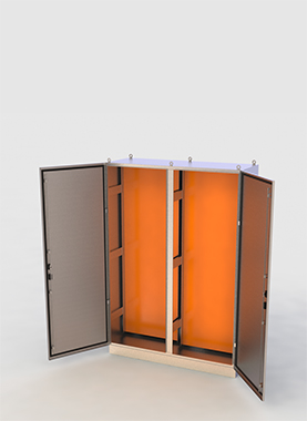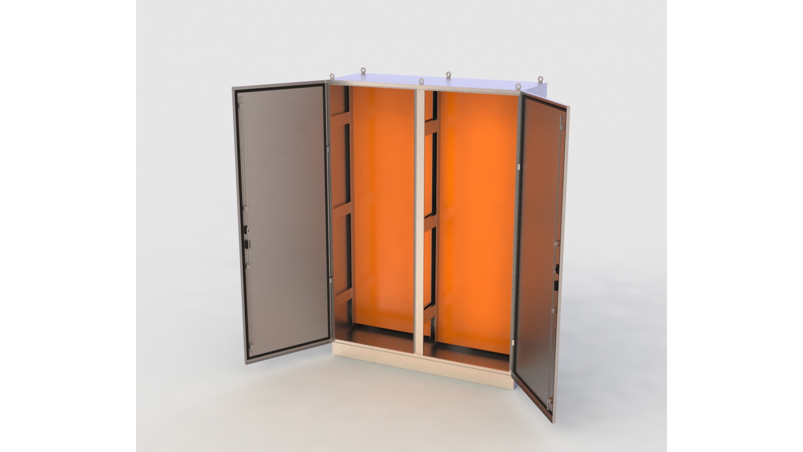 Modelo com 02 portas e divisória central. Equipado com soleira de 100mm e 06 olhais de aço inox para içamento da caixa. Modelo com trilho de aço inox para posicionamento adequado das placas de montagem.