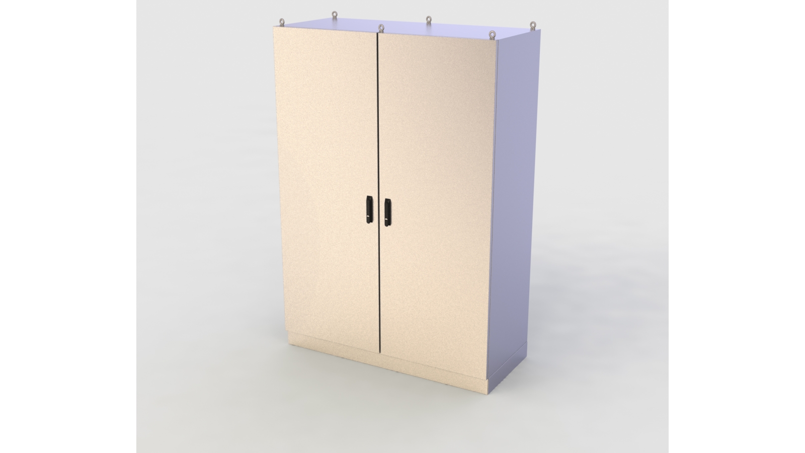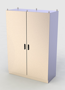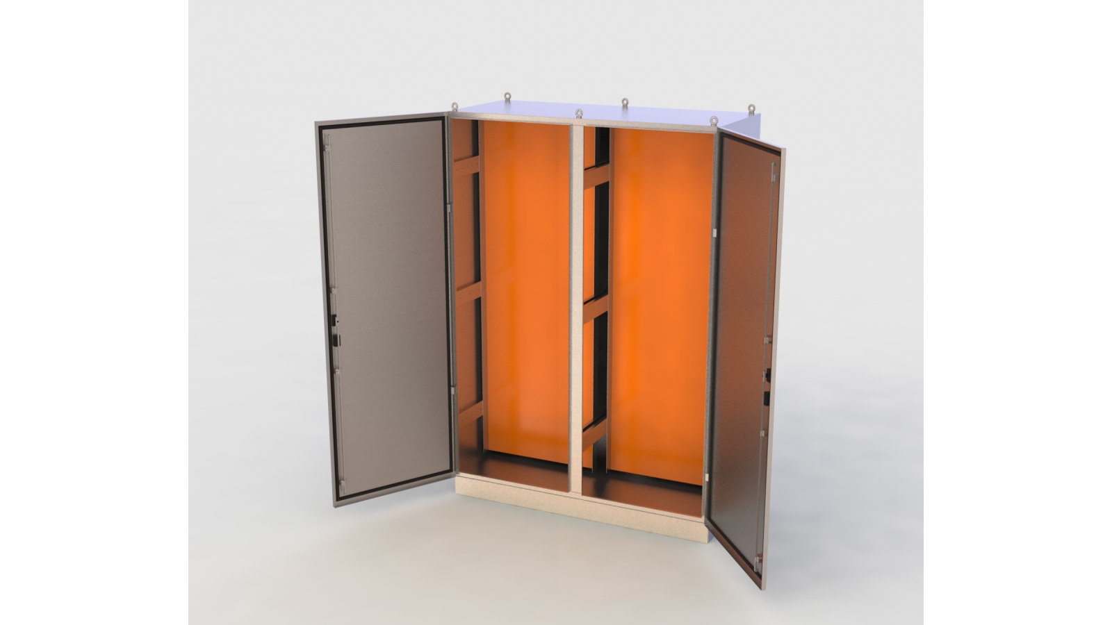 Modelo com 02 portas e divisória central. Equipado com soleira de 100mm e 06 olhais de aço inox para içamento da caixa. Modelo com trilho de aço inox para posicionamento adequado das placas de montagem.