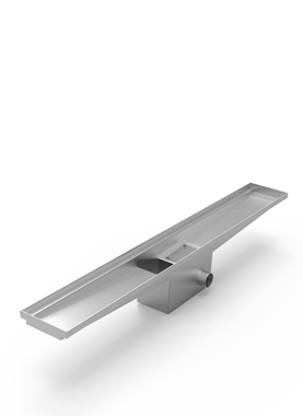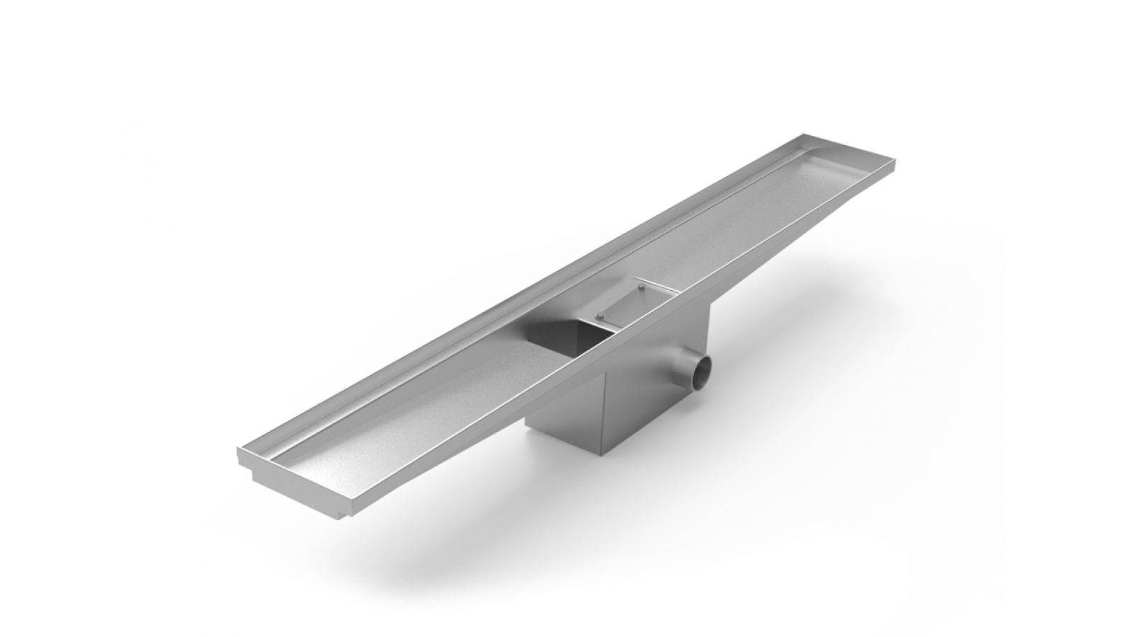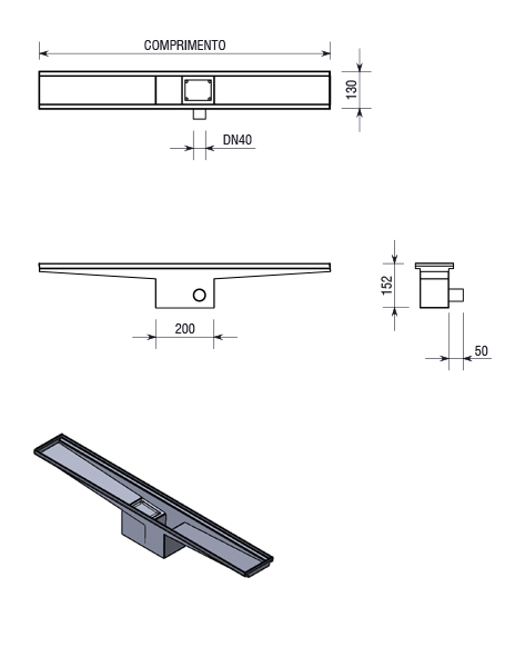 Calha de Escoamento fabricada em aço inoxidável AISI 304, com acabamento escovado. Base feita em chapa de 2,0mm (#14). Com caimento para o reservatório central. Dotada de mecanismo de sifonamento e saída lateral com tubo schedule de 1 1/4. Grelha não inclusa. Largura de 130mm.