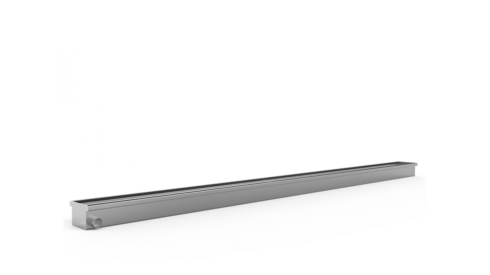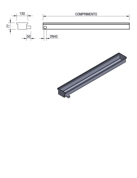 Calha de escoamento fabricada em aço inoxidável AISI 304, com acabamento escovado. Base feita em chapa de 1,2mm (#18), largura de 130mm e 77mm de altura. Quatro direções de saída pra esgoto: na extremidade, na lateral esquerda, direita, e por baixo, com opções de posicionamento. Saída em tubo SCH 40 1 1/4 X 25mm de comprimento. Calha usada em conjunto com Grelha Palmetal. Grelha não inclusa.