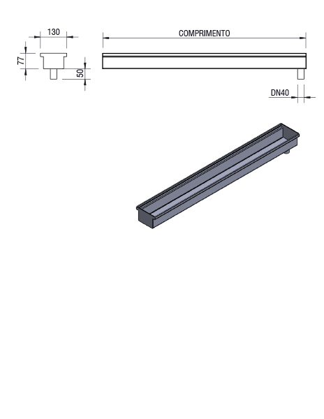 Calha de escoamento fabricada em aço inoxidável AISI 304, com acabamento escovado. Base feita em chapa de 1,2mm (#18), largura de 130mm e 77mm de altura. Quatro direções de saída pra esgoto: na extremidade, na lateral esquerda, direita, e por baixo, com opções de posicionamento. Saída em tubo SCH 40 1 1/4 X 25mm de comprimento. Calha usada em conjunto com Grelha Palmetal. Grelha não inclusa.