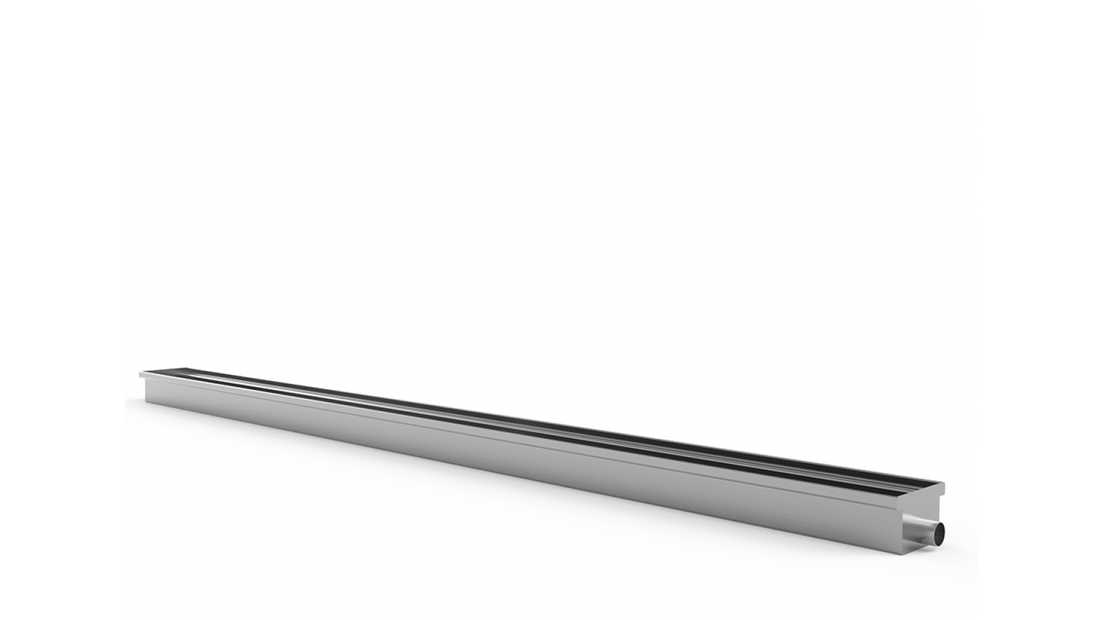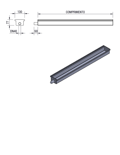 Calha de escoamento fabricada em aço inoxidável AISI 304, com acabamento escovado. Base feita em chapa de 1,2mm (#18), largura de 130mm e 77mm de altura. Quatro direções de saída pra esgoto: na extremidade, na lateral esquerda, direita, e por baixo, com opções de posicionamento. Saída em tubo SCH 40 1 1/4 X 25mm de comprimento. Calha usada em conjunto com Grelha Palmetal. Grelha não inclusa.