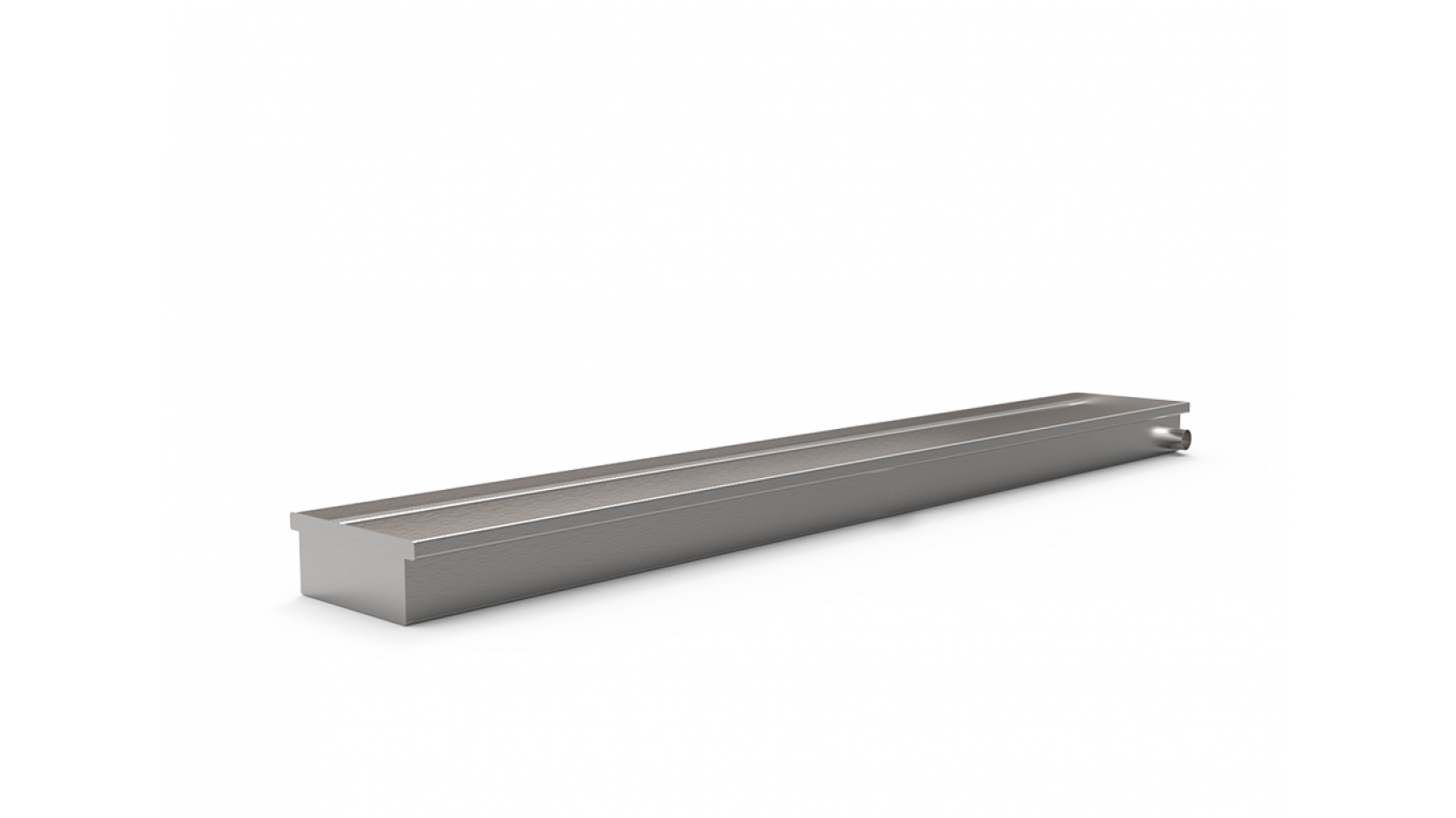 Calha de escoamento fabricada em aço inoxidável AISI 304, com acabamento escovado. Base feita em chapa de 1,2mm (#18), largura de 200mm e 77mm de altura. Saída em tubo SCH 40 1" 1/4 X 25mm de comprimento. Calha usada em conjunto com a Grelha Palm