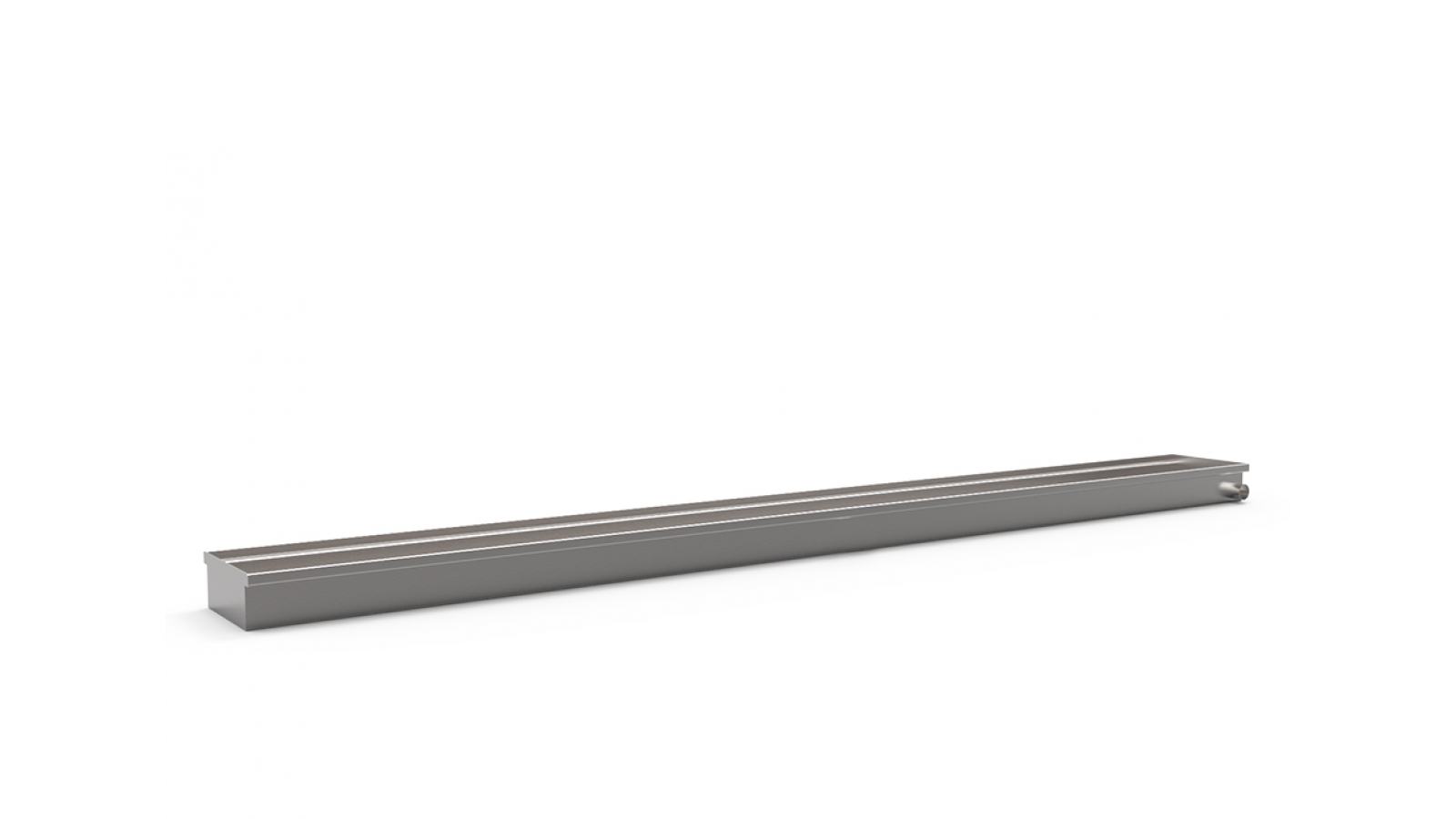 Calha de escoamento fabricada em aço inoxidável AISI 304, com acabamento escovado. Base feita em chapa de 1,2mm (#18), largura de 200mm e 77mm de altura. Saída em tubo SCH 40 1" 1/4 X 25mm de comprimento. Calha usada em conjunto com a Grelha Palm
