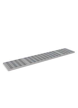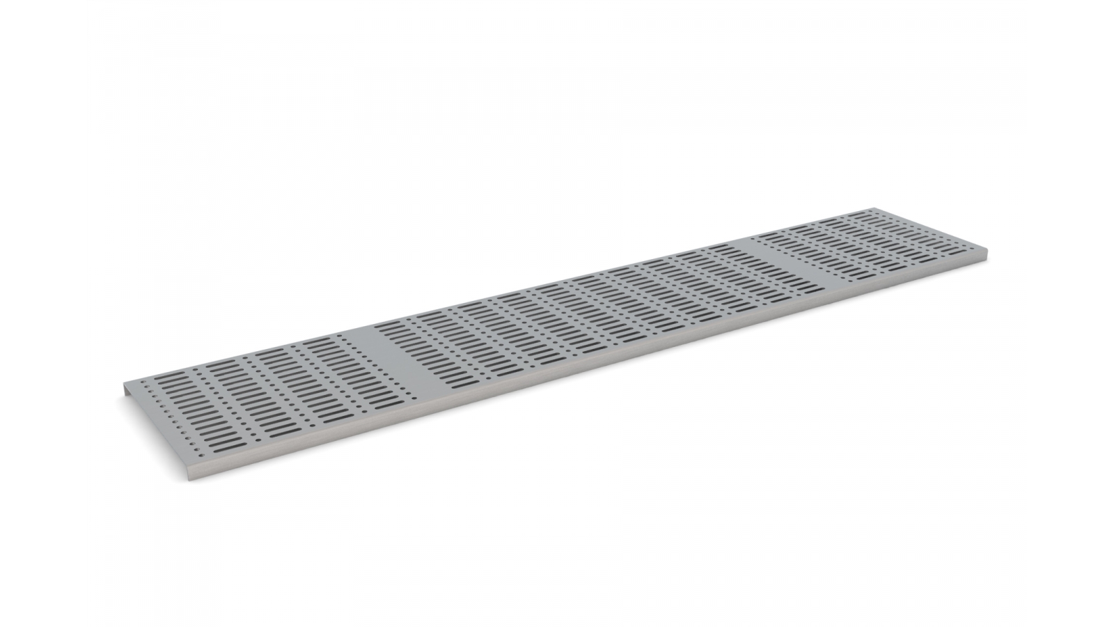 Grelha fabricada em aço inoxidável AISI 304, com acabamento escovado e chapa de 2mm, com reforços por chassis de 1mm de espessura. Chapa puncionada com furos de 5mm de diâmetro e oblongos de diâmetro de 5mm por 30mm de comprimento. Reforço em perfil U de inox a cada 500mm de comprimento. Para uso em conjunto com a Calha ou Moldura Palmetal - item não está incluído, deve ser adicionado ao pedido.