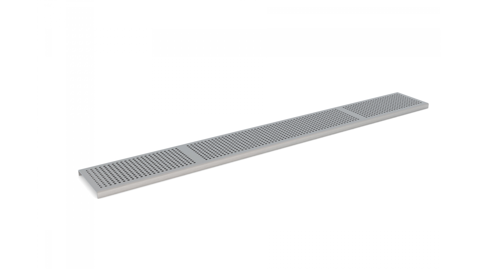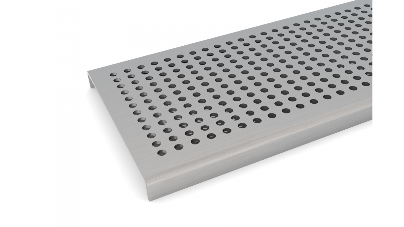 Grelha fabricada em aço inoxidável AISI 304, com acabamento escovado e chapa de 2mm (#14), com reforços por chassis de 1mm de espessura. Reforço em perfil U de inox a cada 500mm de comprimento. Chapa puncionada com furos de 5mm de diâmetro. Para uso em conjunto com a Calha Palmetal - item não incluso.