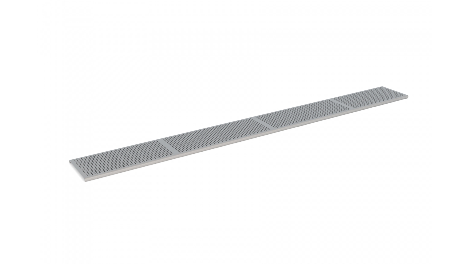 Grelha fabricada em aço inoxidável AISI 304, com acabamento escovado e chapa de 2mm (#14), com reforços por chassis de 1mm de espessura. Reforço em perfil U de inox a cada 500mm de comprimento. Chapa puncionada com furos de 5mm de diâmetro. Para uso em conjunto com a Calha Palmetal - item não incluso.