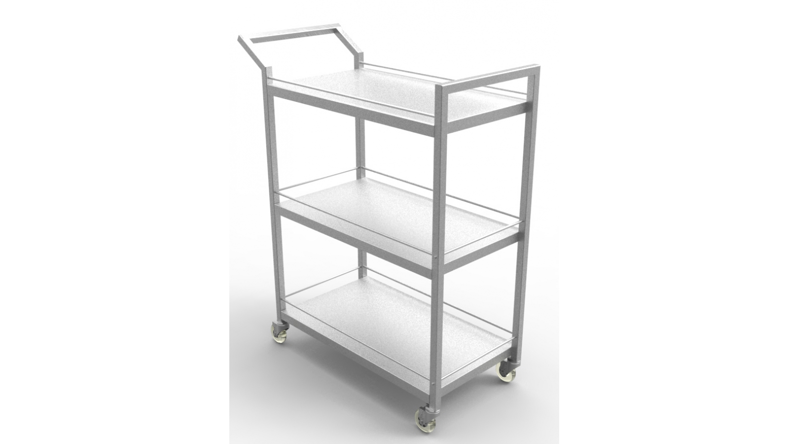 Fabricada em aço inox AISI 304, tubo 20 x 20 mm, chapa 1mm e rodízios de inox com rodas de silicone de 3. Altura fixa de 900mm. Acabamento escovado.