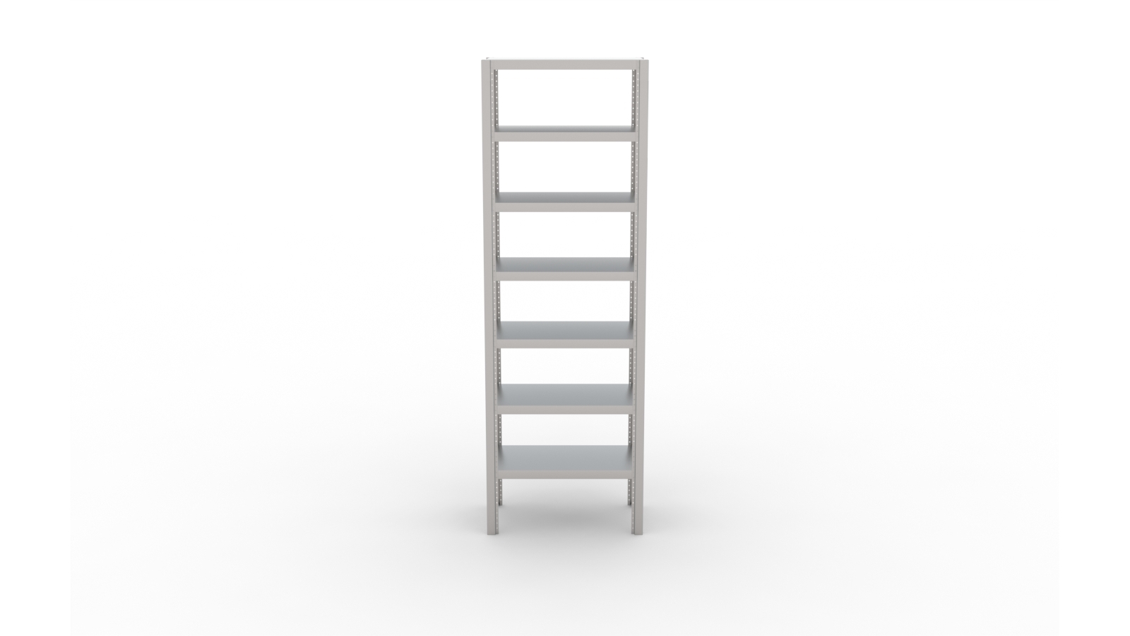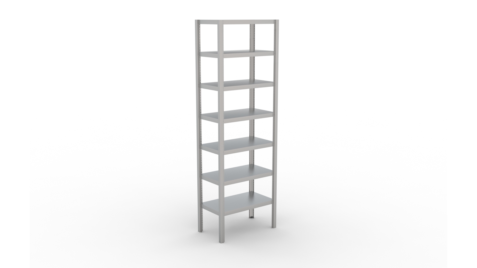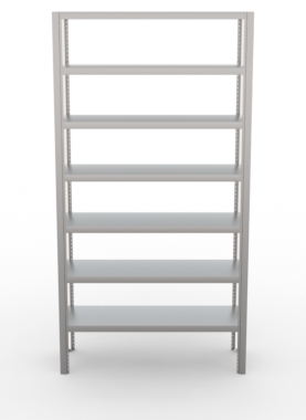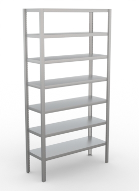 O Modelo PLC é estruturado com cantoneiras modulares de design exclusivo, reduzindo custos de transporte, além de proporcionar um visual mais leve ao ambiente. A cantoneira possui furação em todo seu perfil proporcionando liberdade de regulagem das alturas das prateleiras, que acompanham parafusos em aço inox.