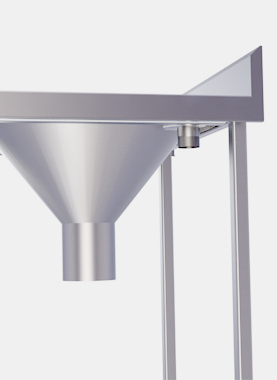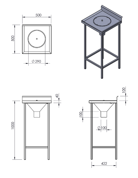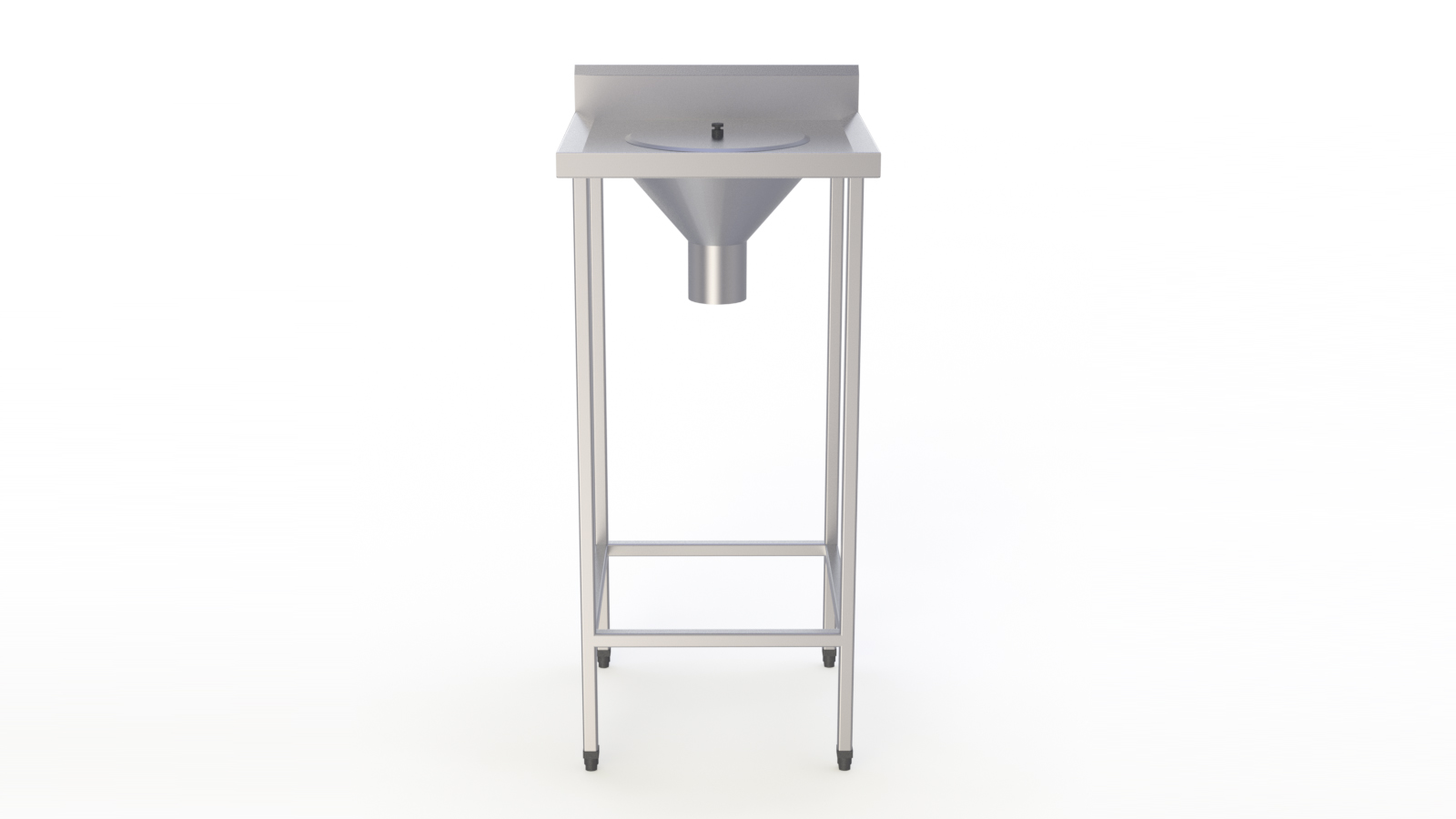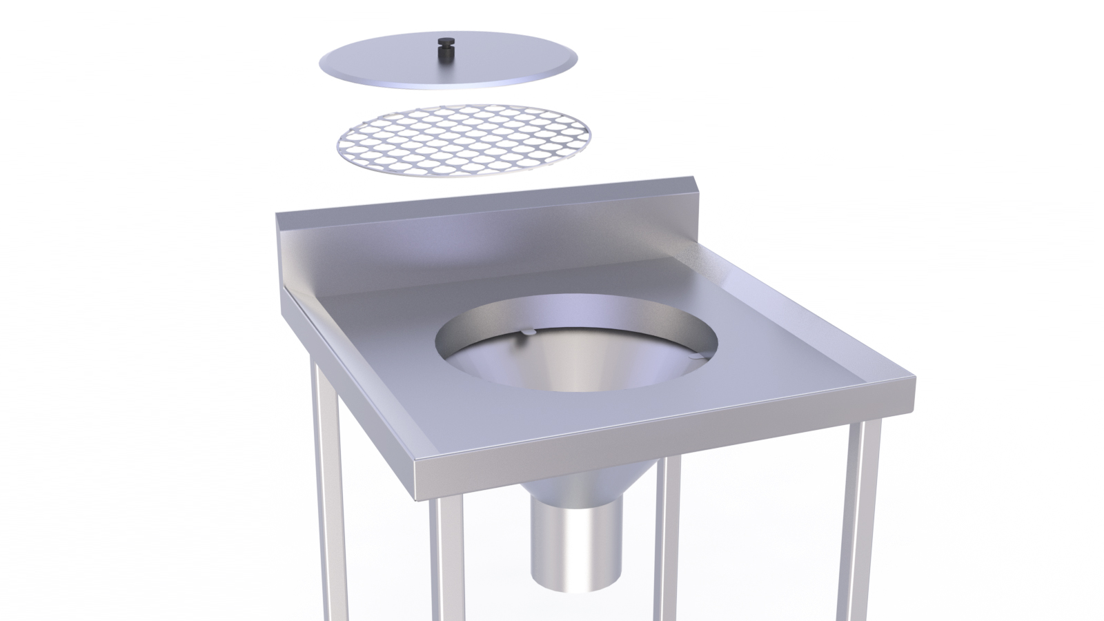 Expurgo redondo econômico simples com pés tubulares e sapatas reguláveis. Fabricado totalmente em aço inox AISI 304, chapa 1mm #20, acabamento escovado. Possui tampa e grade removíveis.