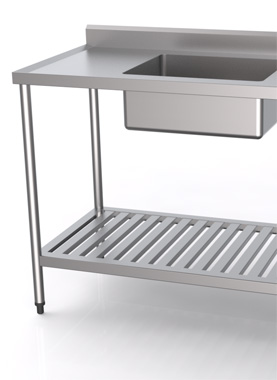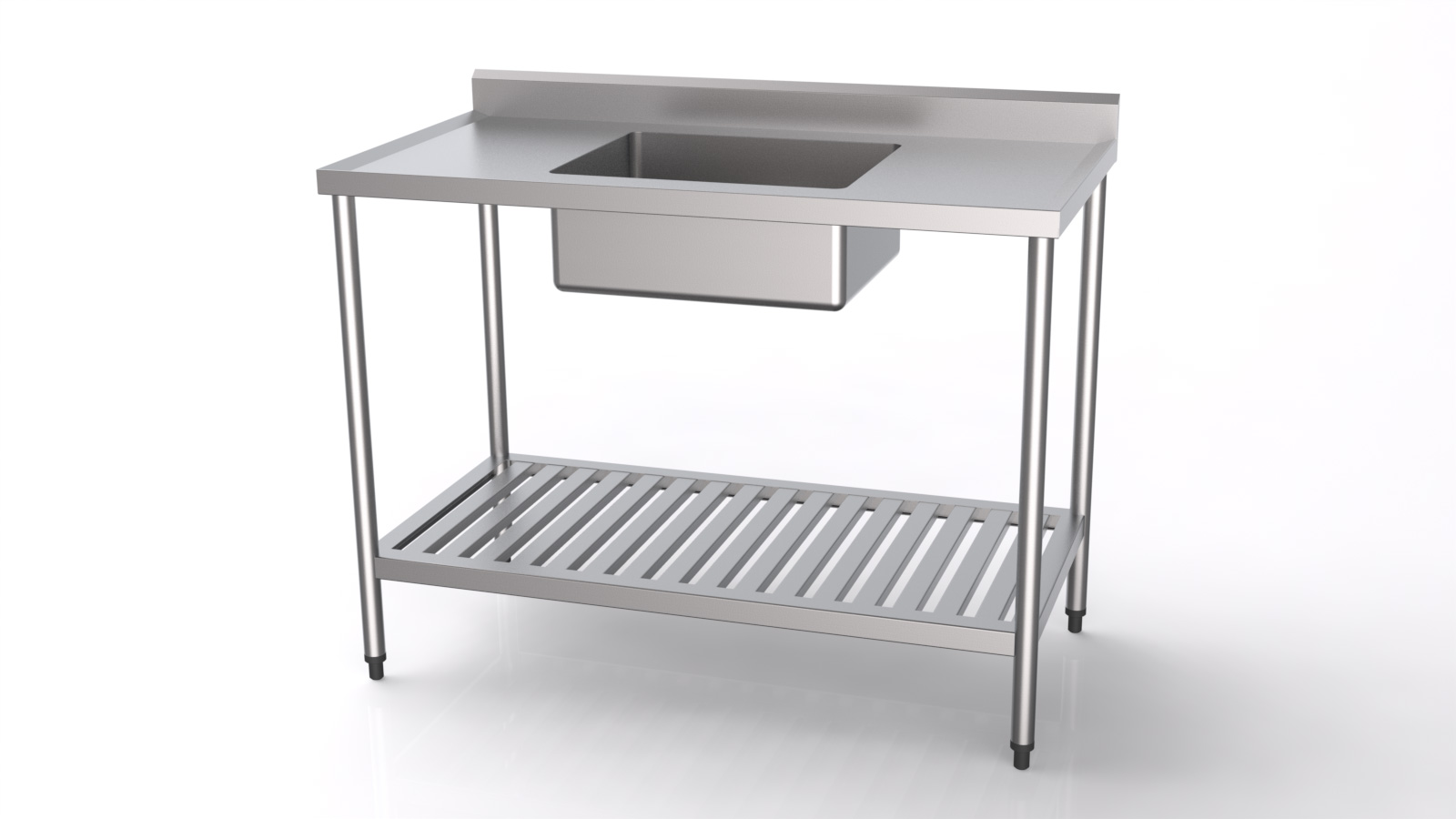 Fabricado em aço inox AISI 304, pés em tubo de 1 1/2 e contraventamento em tubo de 1. Tem frontispício e prateleira gradeada na parte inferior. Acompanha cuba centralizada de 500x400x200mm em aço inoxidável.